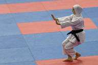 Fotografia da prova de kata feminina 13–14 anos e 7º–9º kyu do torneio internacional da Funakoshi Shotokan Karate Association.